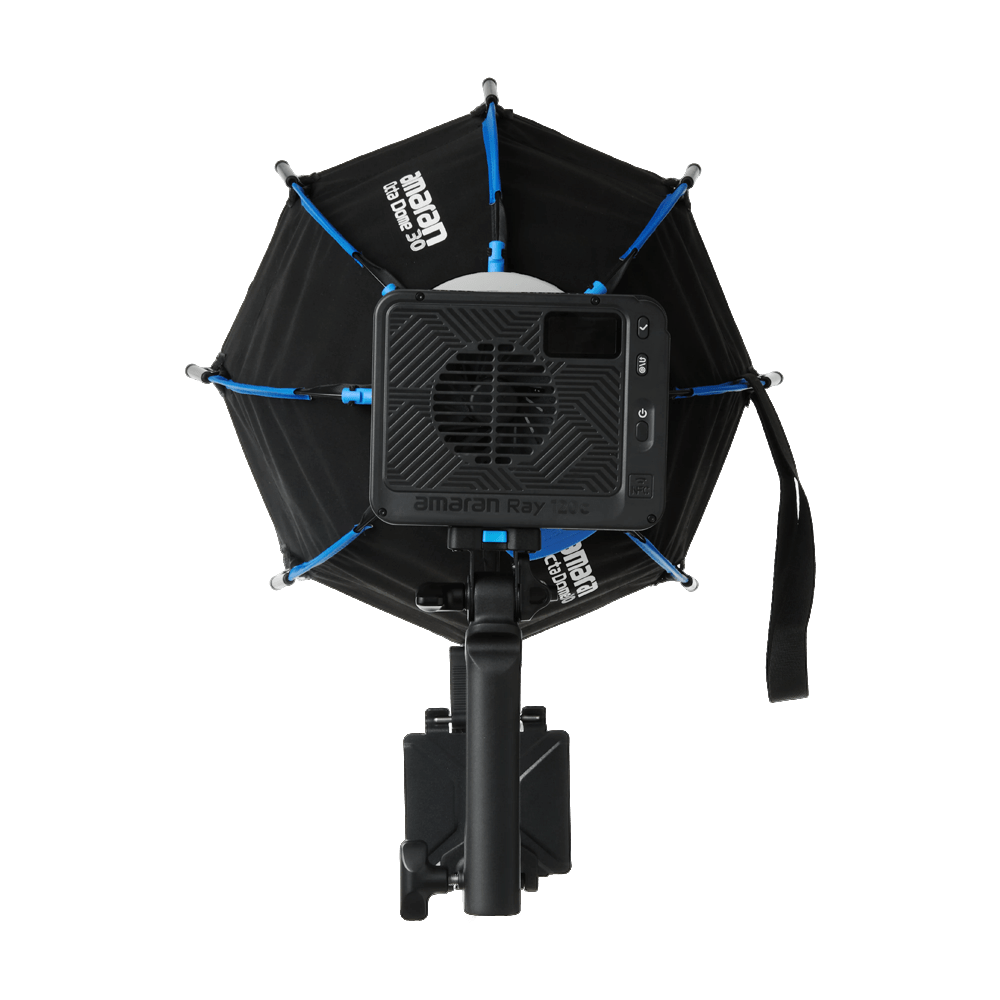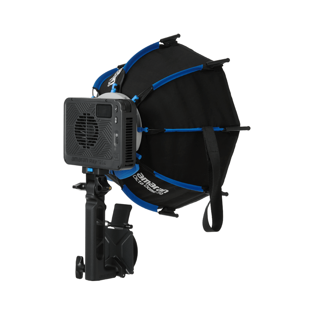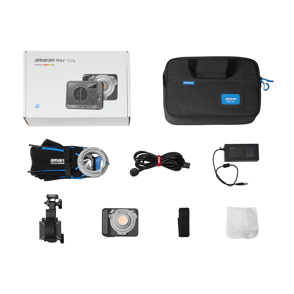 The amaran Ray 120c comes as a ready-to-shoot kit, including the all-new amaran Octa Dome 30 softbox and accessories, Ace Lock to Baby Pin Adapter, Power Adapter, and Cable, all in a dedicated bag – so you get a complete lighting setup wherever you create.