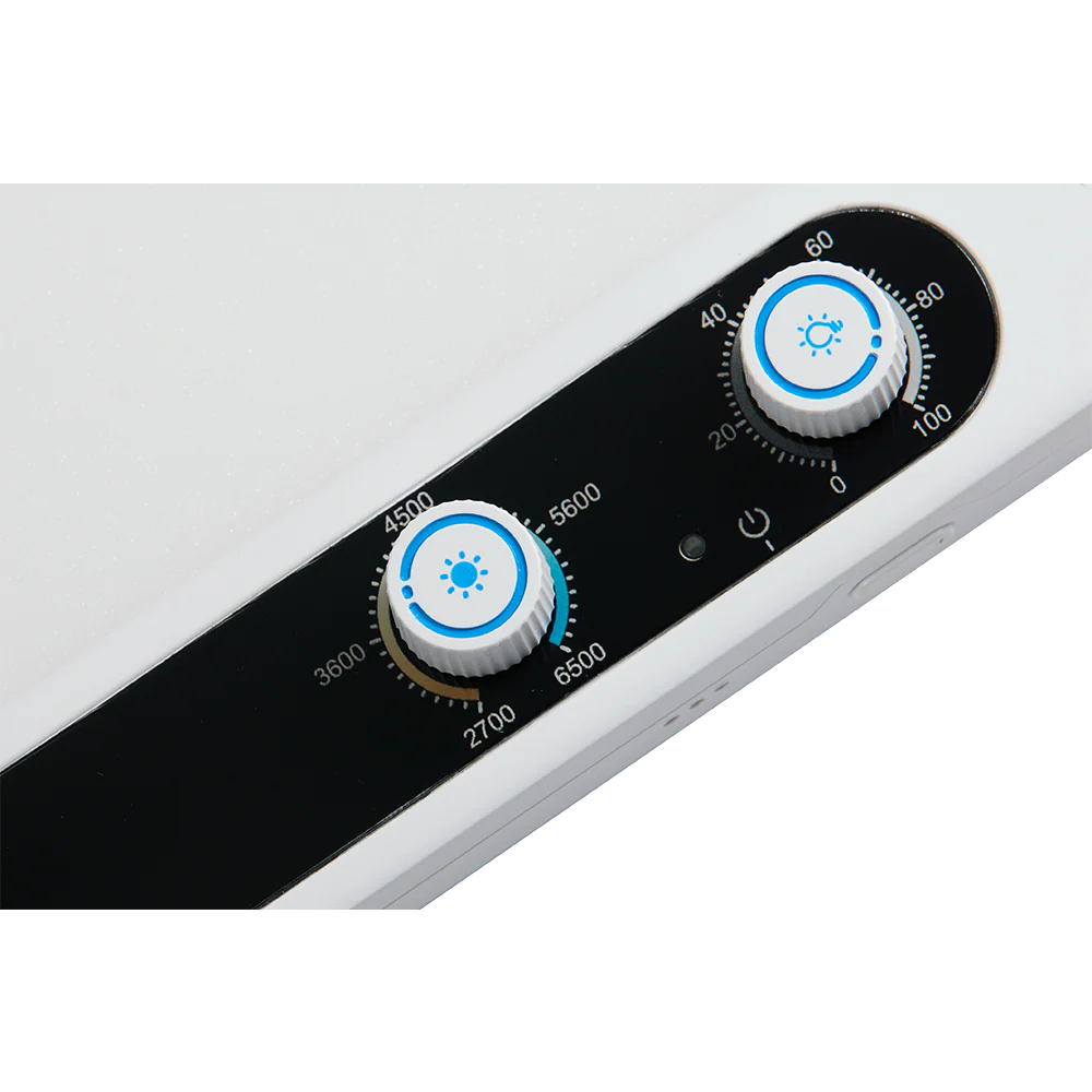 - Bi-color, edge-lit rectangular panel light designed for desktop creators