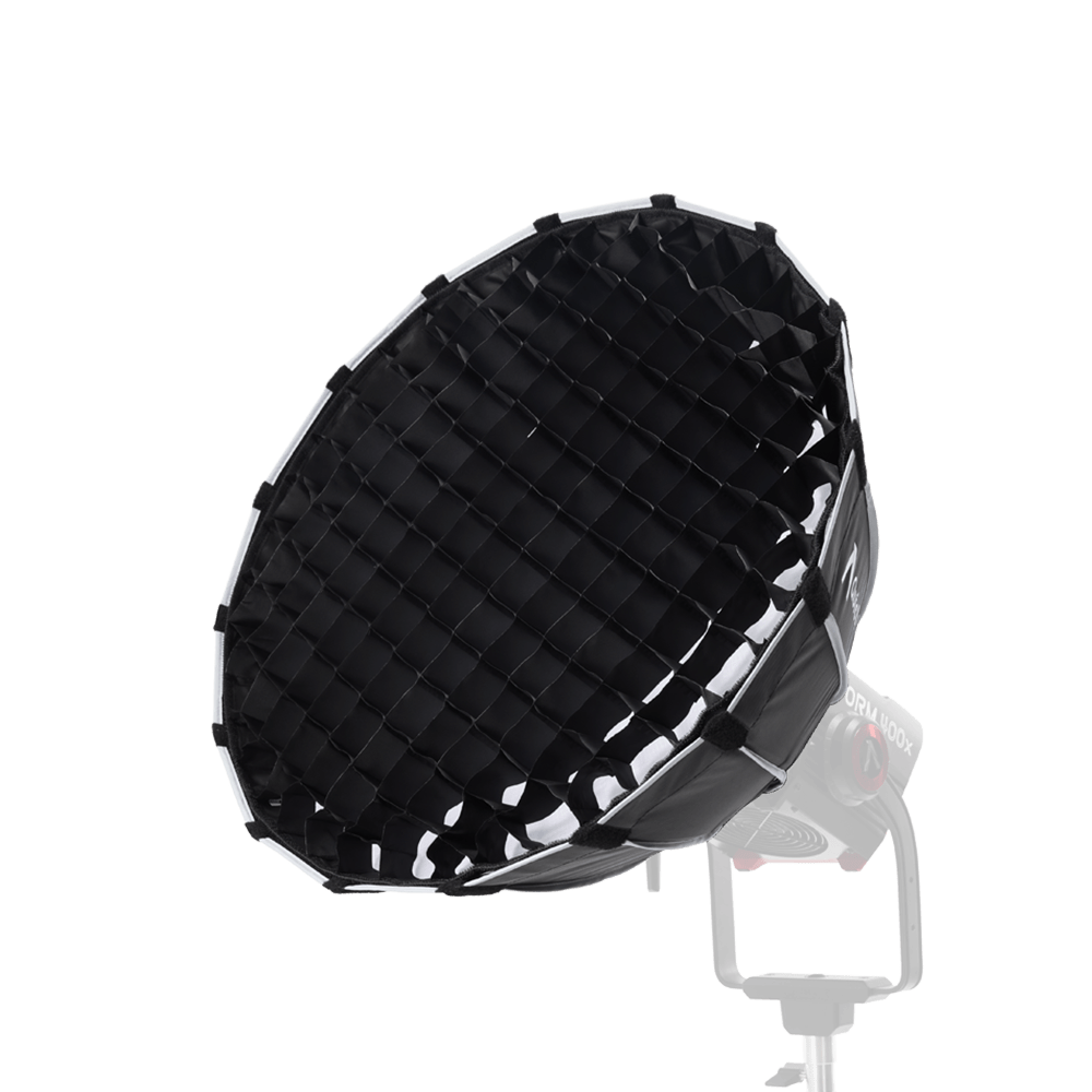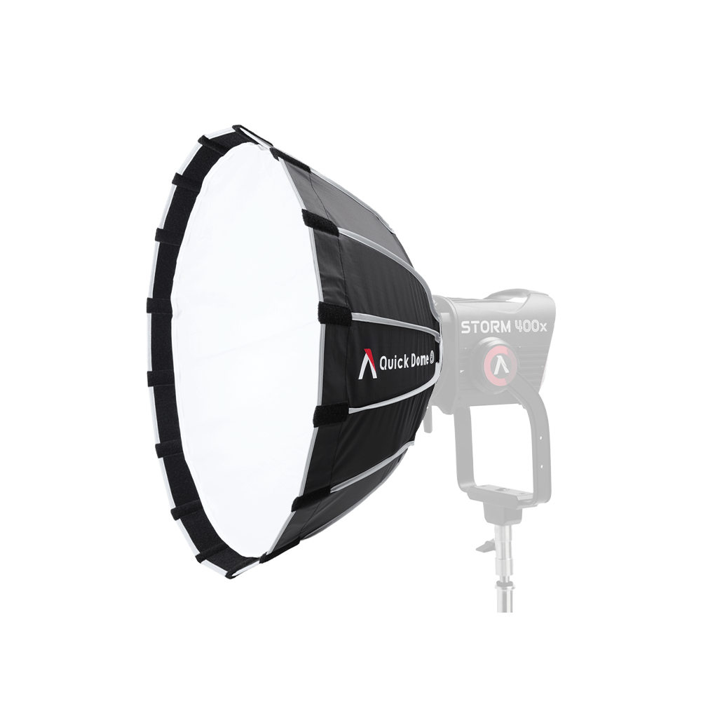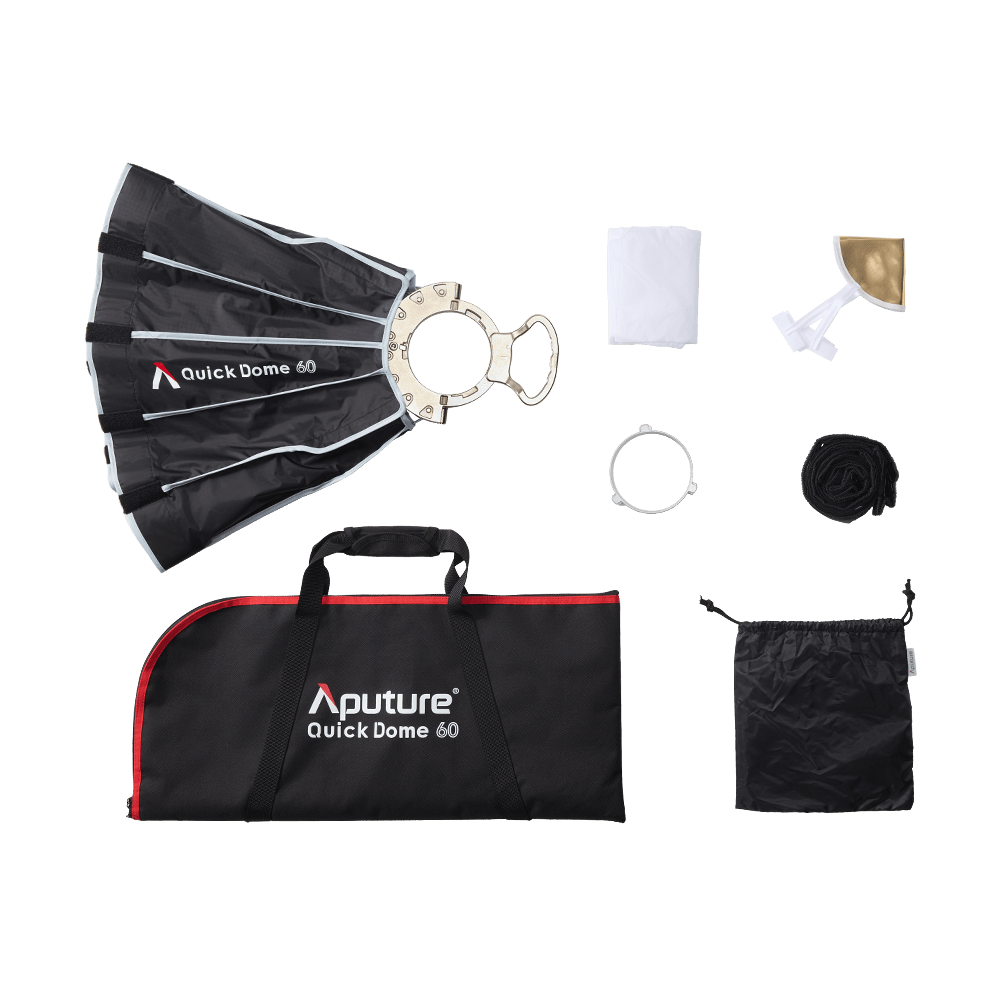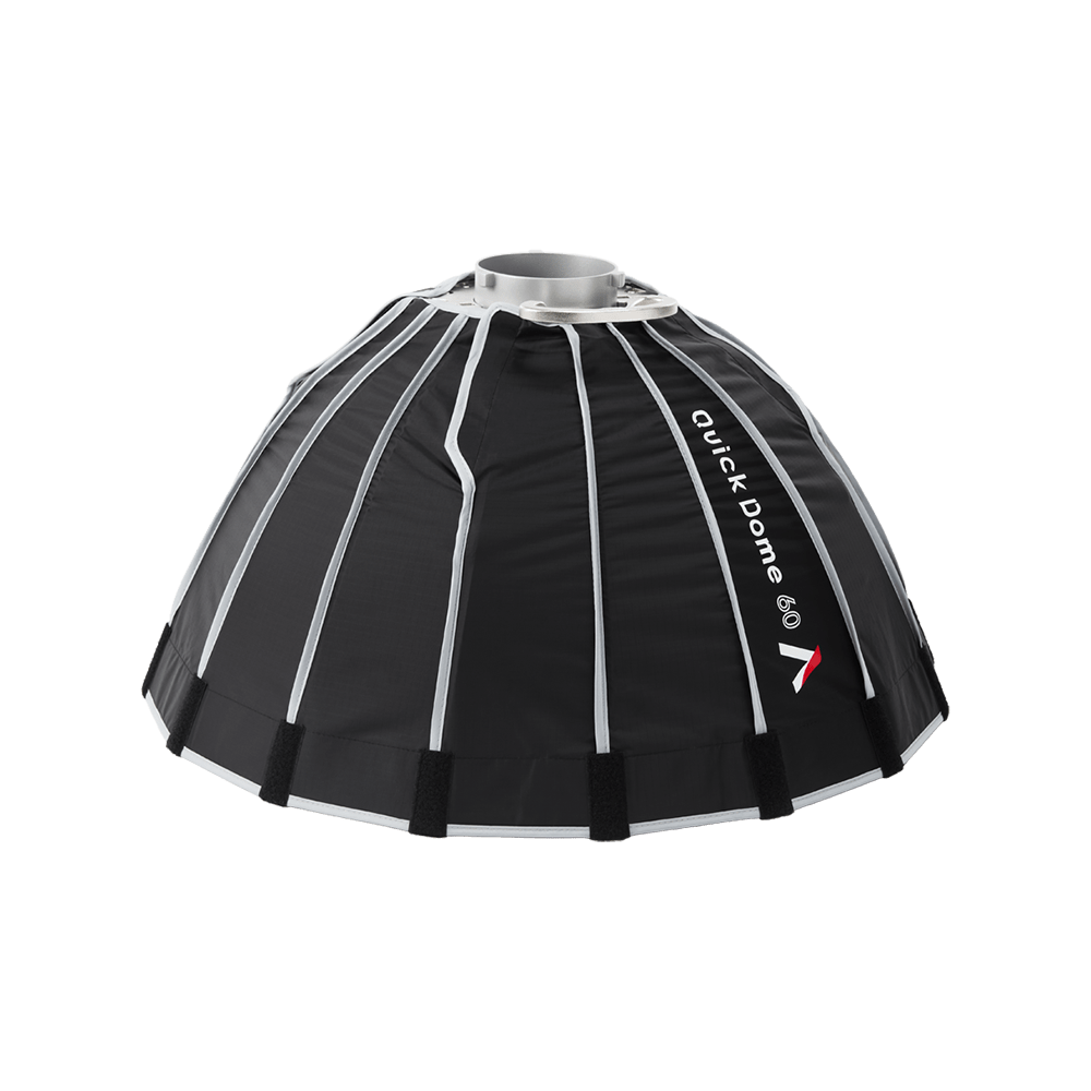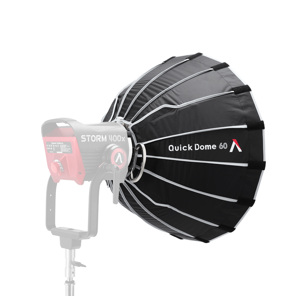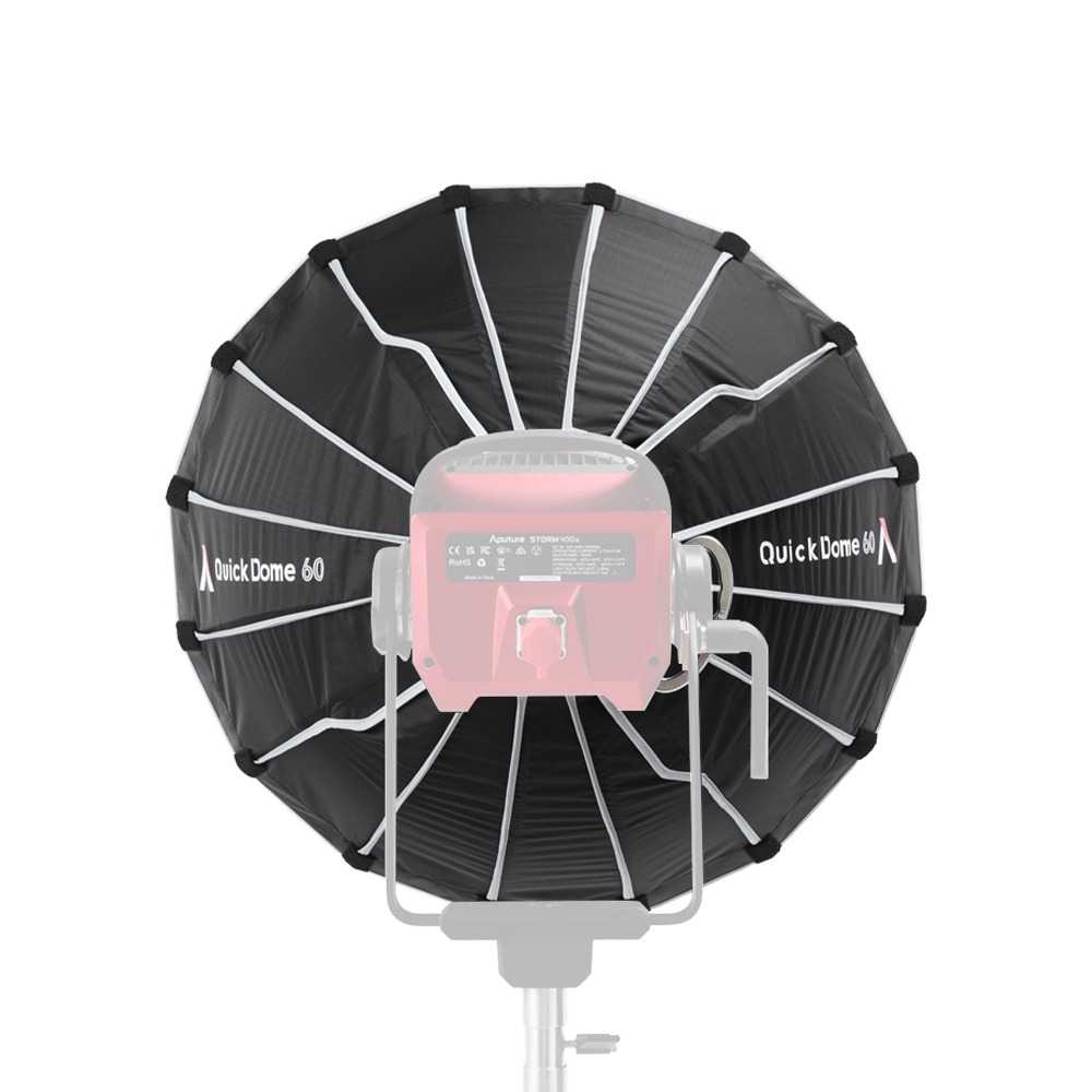 The Quick Dome 60 from Aputure is a circular Bowens mount softbox featuring a parabolic design that pairs with the STORM and Light Storm fixtures. The softbox has a reflective silver interior and provides a soft, even light output.