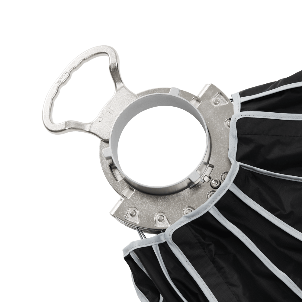 A quick release latch on the speed ring allows users to quickly set up the tension on all 16 steel support rods in seconds, making installation a breeze. The lateral side handle provides easy mounting setup and control and comfort when mounting. When not in use, the softbox folds down flat, making it easy to store in the included carry bag.