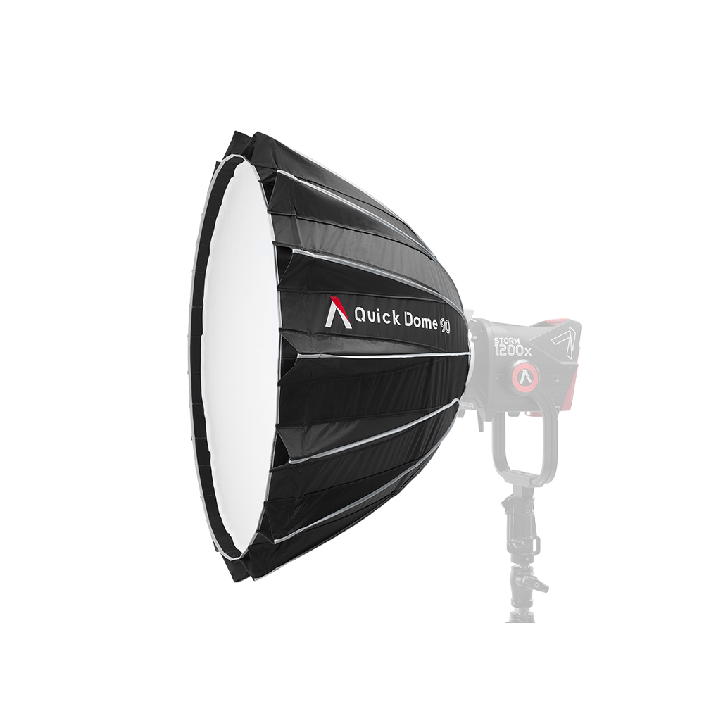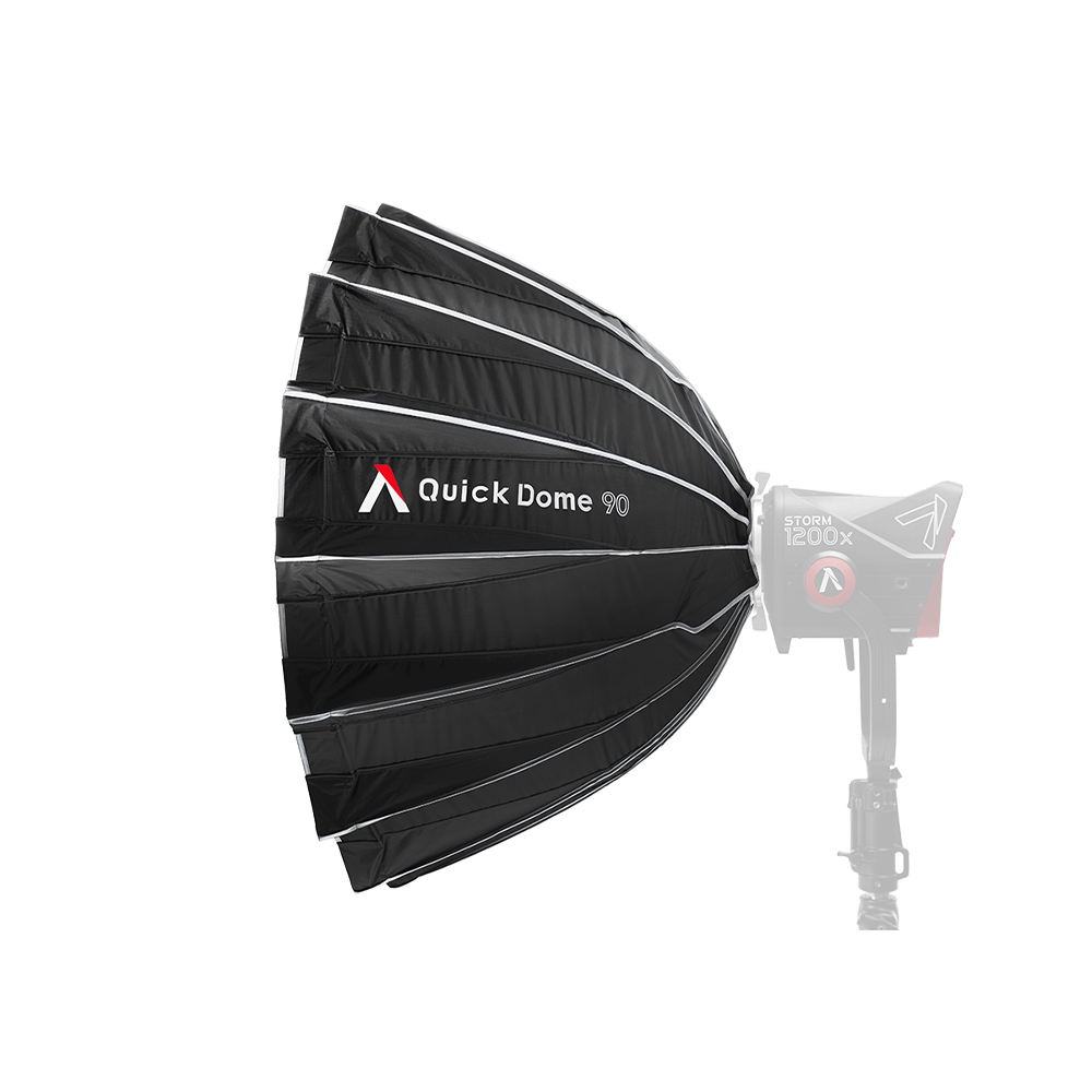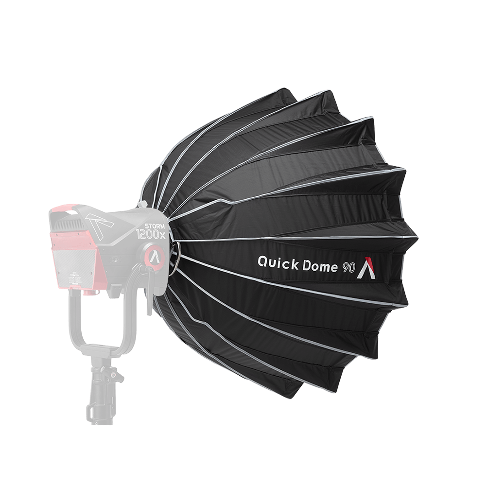 The Quick Dome 90 from Aputure is a a circular Bowens mount softbox featuring a parabolic design that pairs with the STORM, Electro Storm, and Light Storm fixtures. The softbox has a reflective silver interior and provides a soft, even light output.