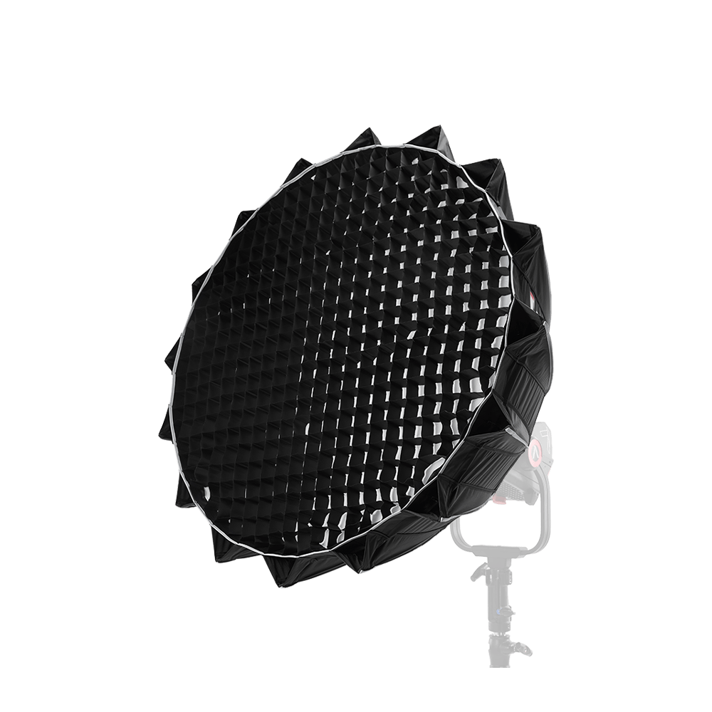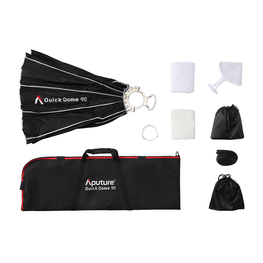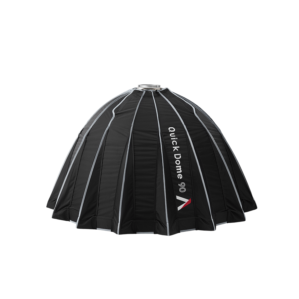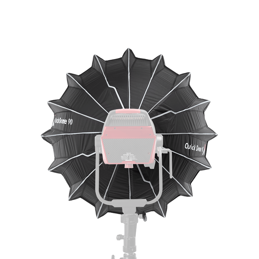The Quick Dome 90 from Aputure is a a circular Bowens mount softbox featuring a parabolic design that pairs with the STORM, Electro Storm, and Light Storm fixtures. The softbox has a reflective silver interior and provides a soft, even light output.