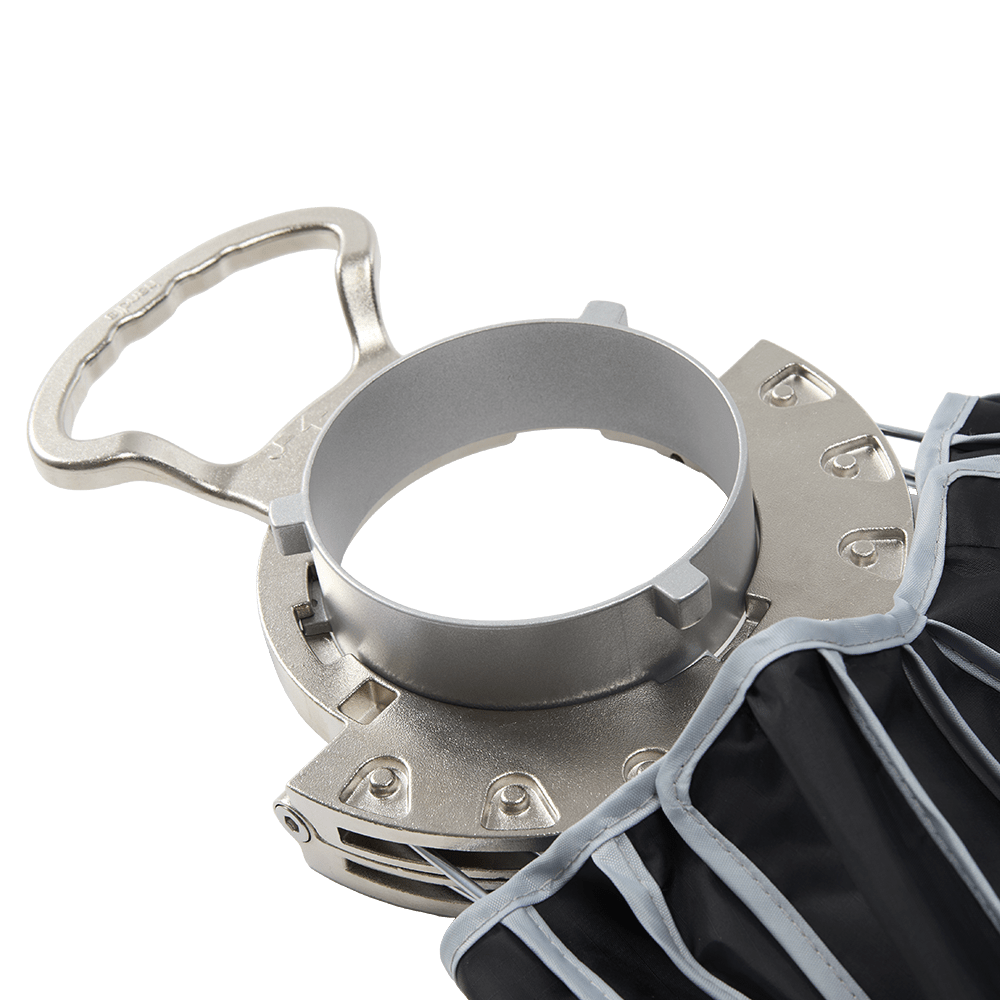 A quick release latch on the speed ring allows users to quickly set up the tension on all 16 steel support rods in seconds, making installation a breeze. The lateral side handle provides easy mounting setup and control and comfort when mounting. When not in use, the softbox folds down flat, making it easy to store in the included carry bag.